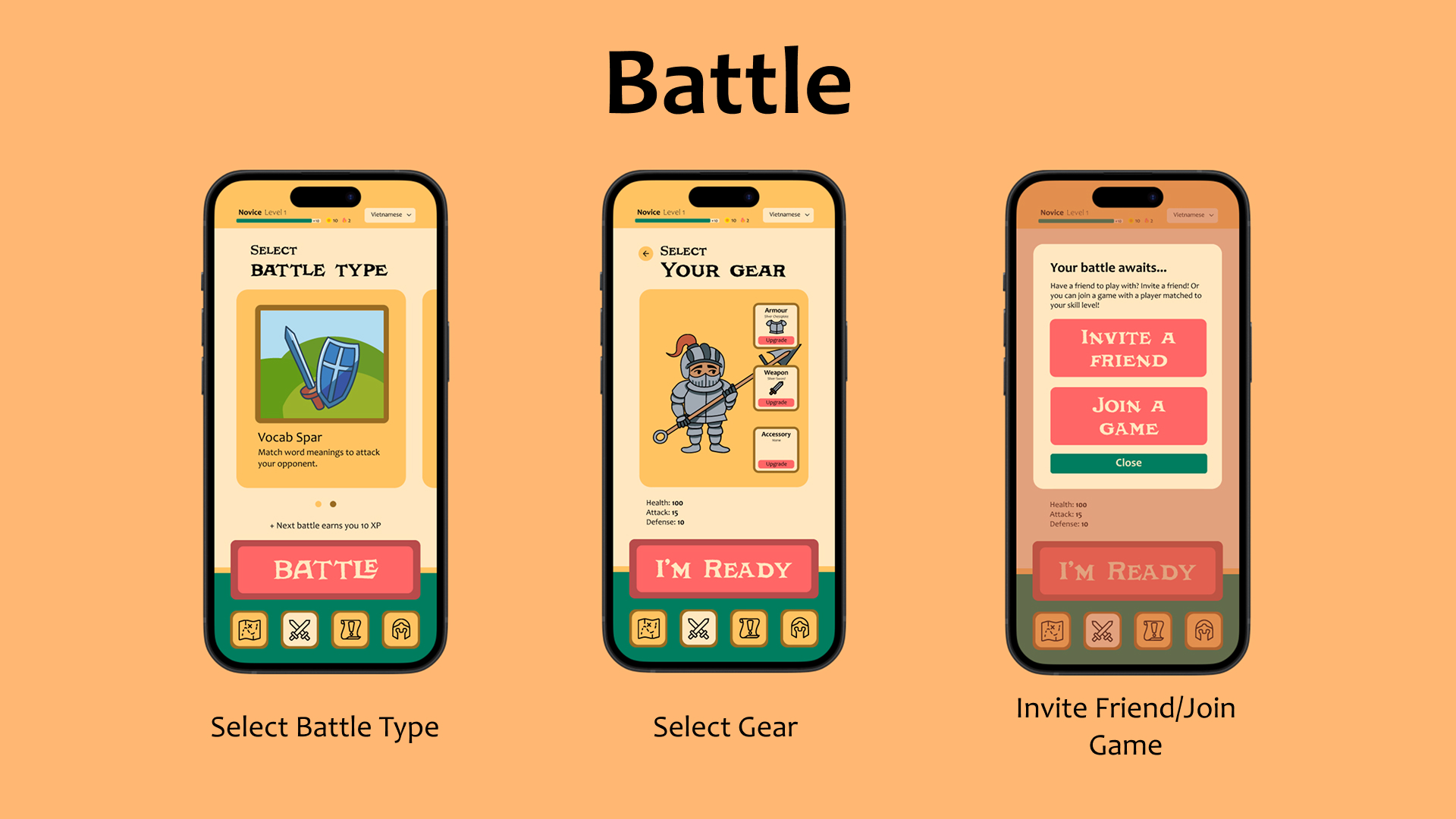 In Diaquest, users train by completing lessons and then apply what they’ve learned through battles with other users. The games dynamically adapt to each player’s progress, allowing friends at different language learning levels to play together!