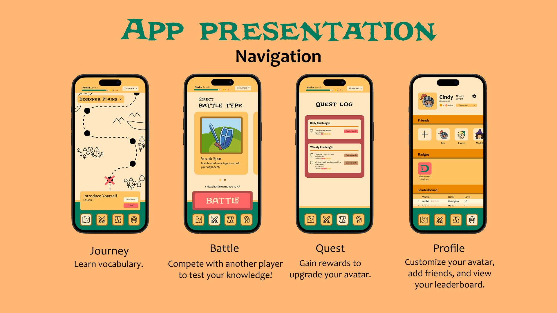 Diaquest is a multiplayer, gamified language-learning app. The goal of Diaquest is to create a fun, social learning experience where users feel like they’re a hero, on a quest to conquer new languages alongside friends. Diaquest is designed to make it easy and enjoyable to learn together.