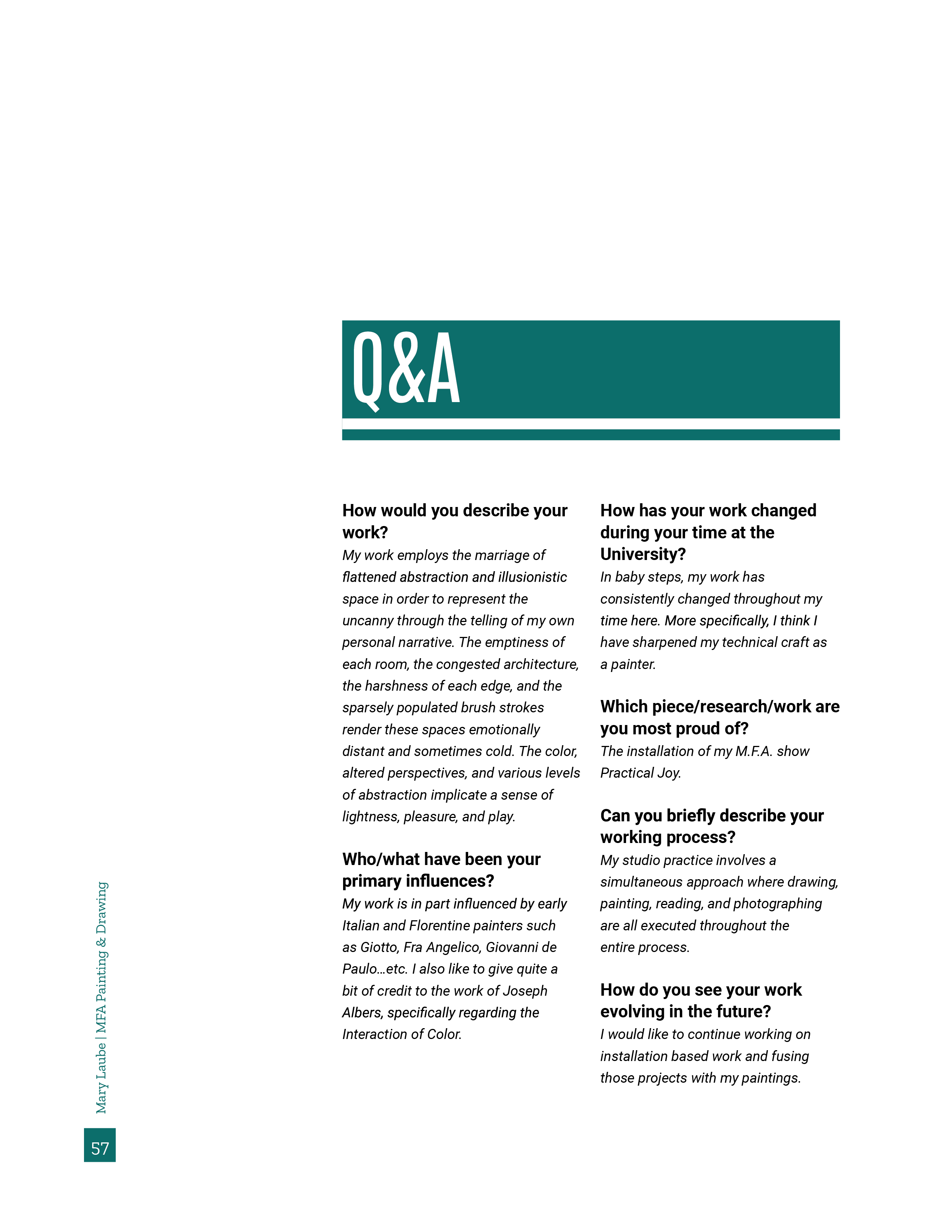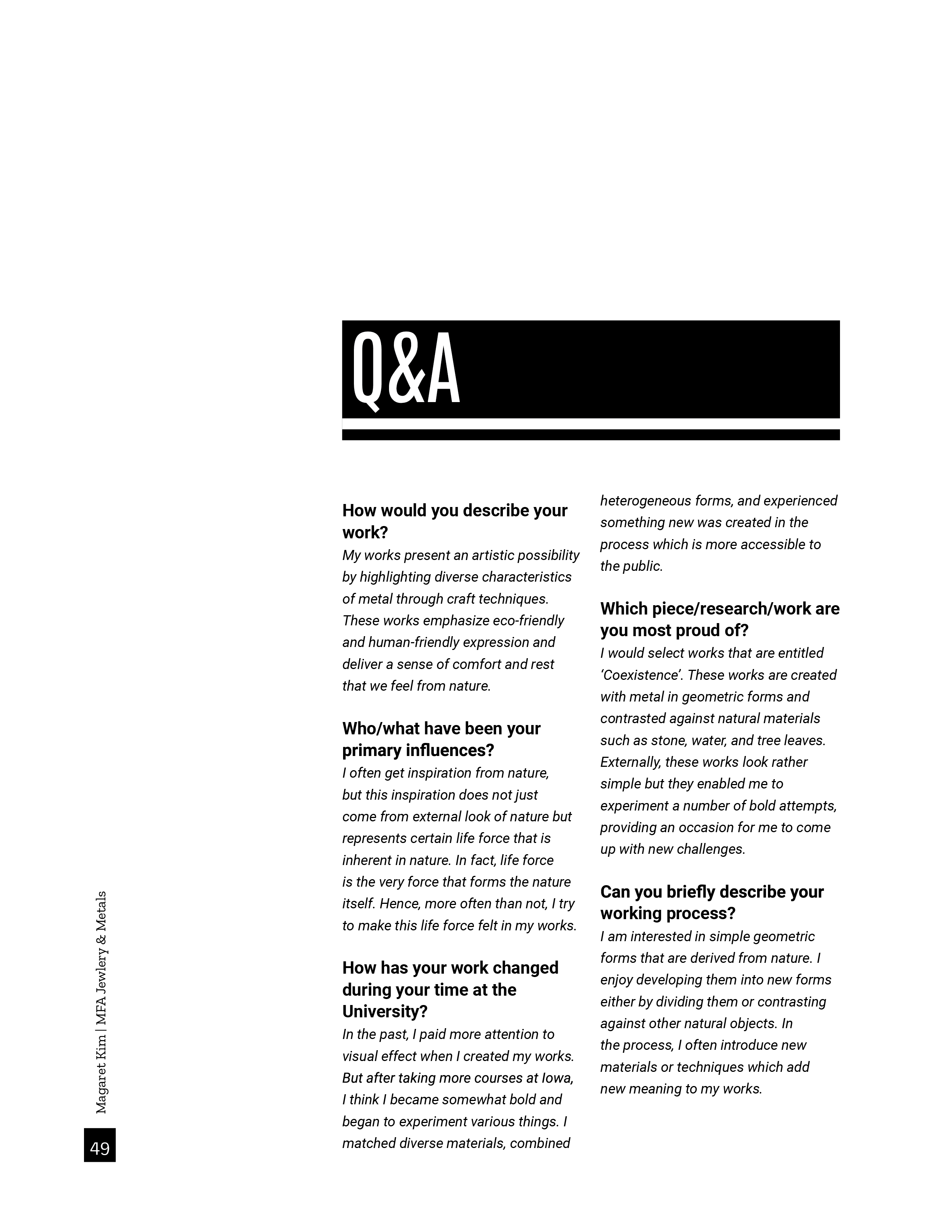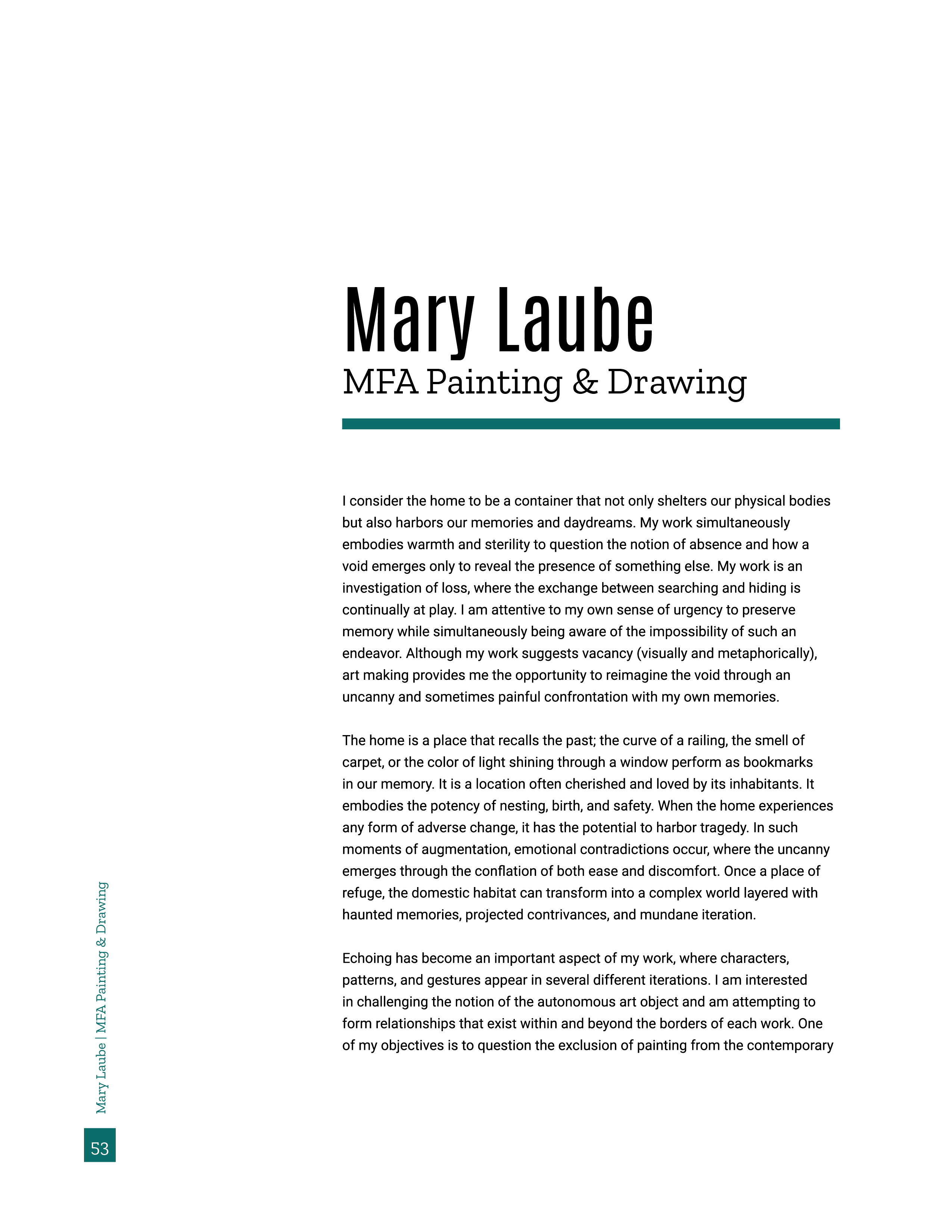 Process is a conceptual magazine for the School of Art and Art History at the University of Iowa (UIOWA). It honors graduate students and their work. The layout is made to complement each artist and bring out the beauty of their work.