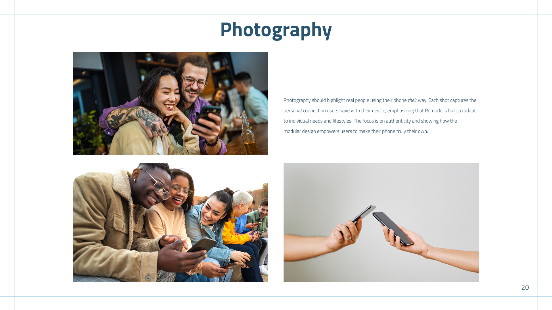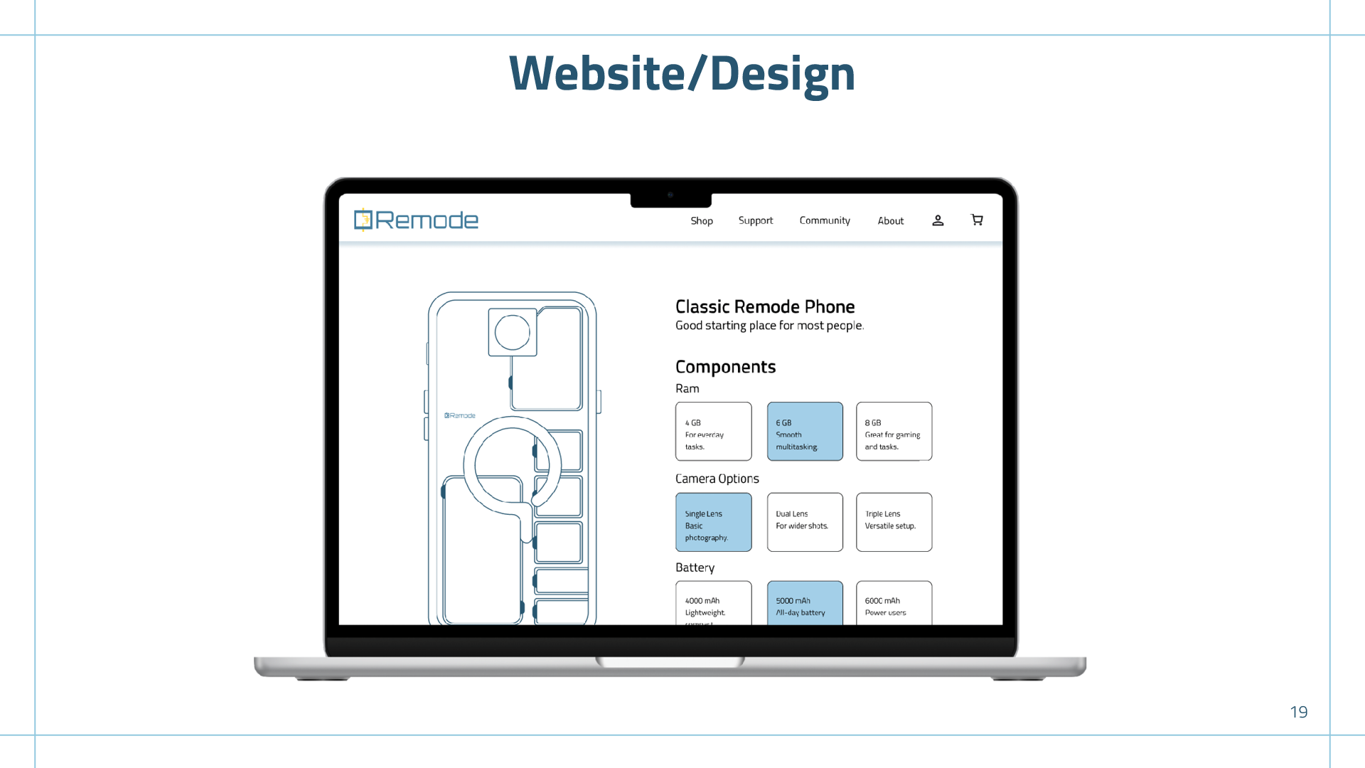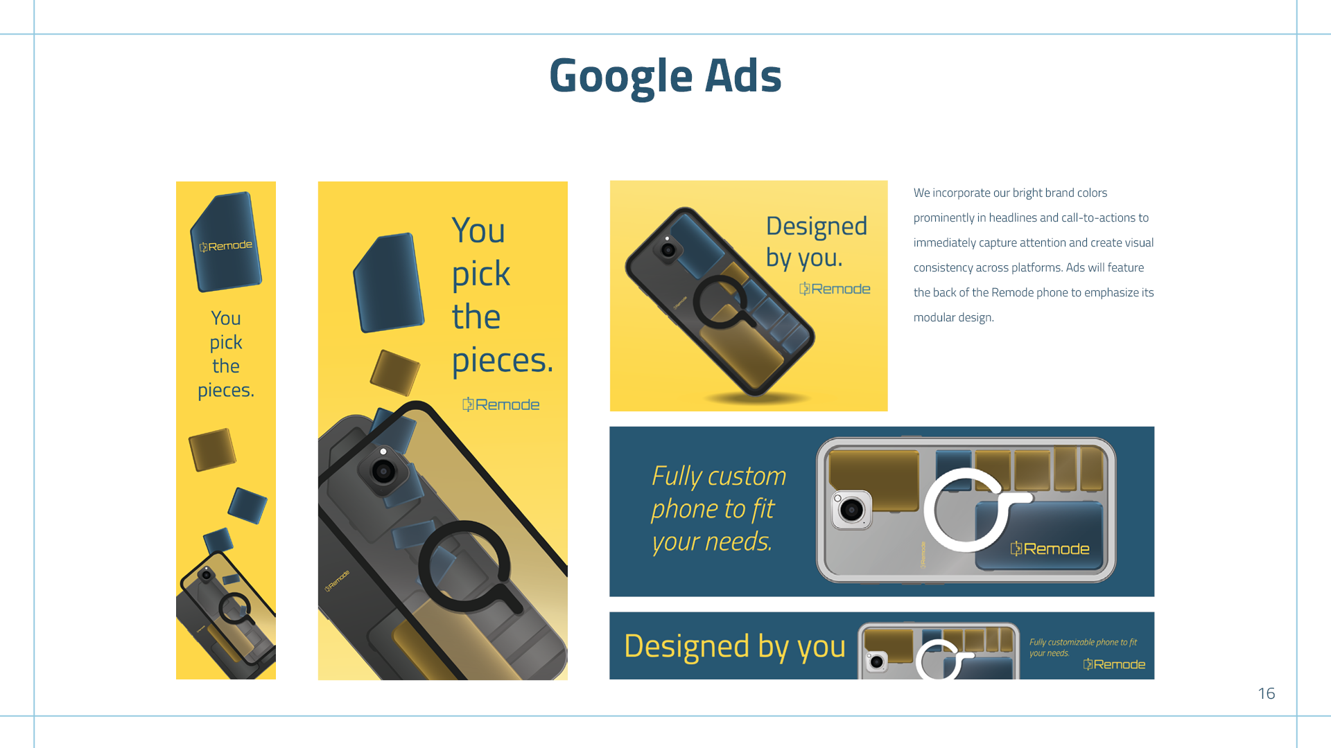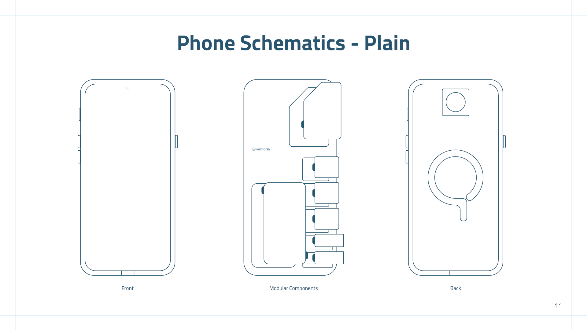Remode is a modular phone. Its modularity enables upgradeability, reducing electronic waste, while also allowing users to customize their device to fit their needs. I wanted the brand to feel like a trustworthy, high-tech product while still being soft around the corners to welcome all different types of users.